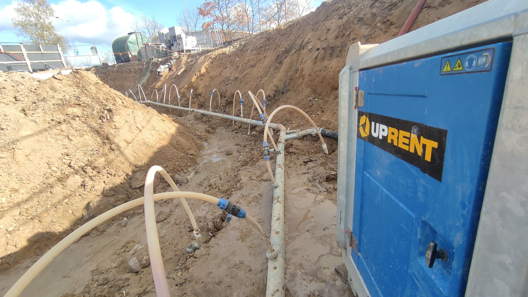 Dėl sudėtingų grunto sąlygų objekte, buvo nuspręsta naudoti vertikalaus drenavimo sprendimą su BBA dyzeliniais siurbliais.